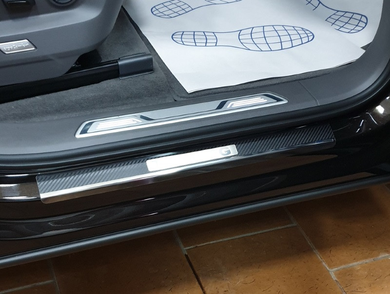 Накладки на внутренние пороги с надписью, нерж. сталь+карбон, 4 шт.